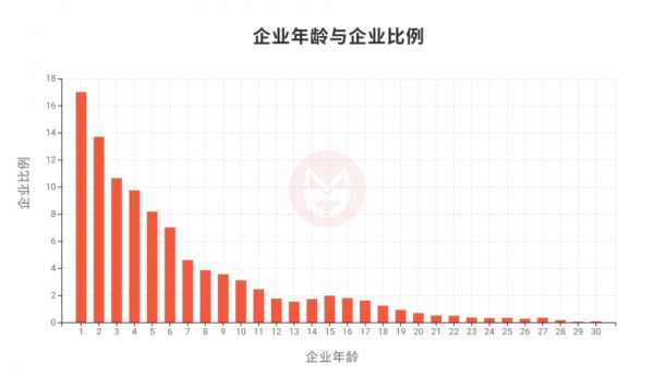 我们再从上面的数据集来看现有企业的存续情况,将2019年上海的企业,按照它们已经存续的时间来进行分类,排列起来如下图所示。企业的年龄分布也是高度极化的,虽然所有企业的平均成立年限达到了6.2年,但在2019年度现存的所有企业中,有一半以上的企业其实成立于最近4年。