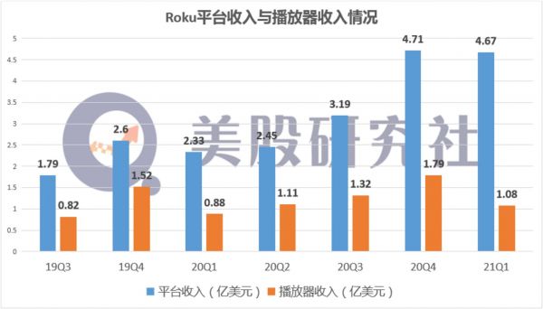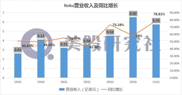 财报显示,Q1Roku实现营收5.74亿美元,超出市场预期的4.91亿美元,去年同期3.21亿美元,同比增长78.8%。