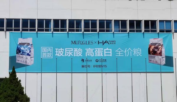 展馆门口也是宠物品牌竞相打广告的地方。唯一看起来“有点技术含量”的,是1号馆入口上方的一款宠物粮广告: