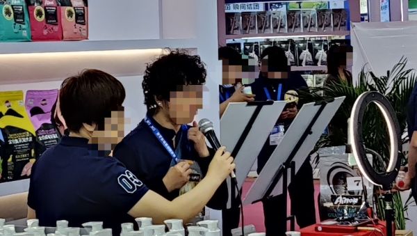 而在展厅另一角的直播间,华熙的工作人员在向观众介绍另一款产品:玻尿酸宠物沐浴露。