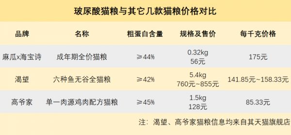 这意味着,这袋售价56元、含量320克的猫粮里,其中玻尿酸成本仅约0.416元,但这个噱头可以直接让其价格飞上枝头。