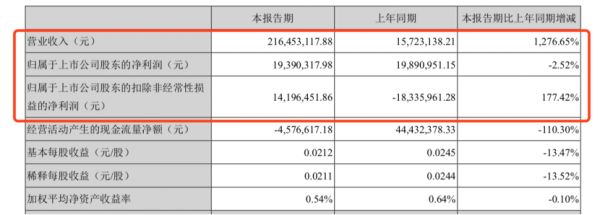 2021年一季报显示,今年1至3月,公司实现营业收入2.16亿元,较上年同期1572.31万元增加超12倍;归属于上市公司股东的扣除非经常性损益后的净利润为1419.65万元,较上年同期增长177%。