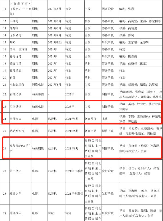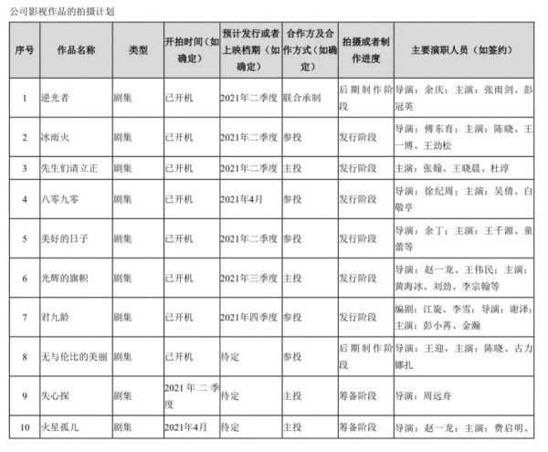 一季报显示公司在手货币资金13.5亿,交易性金融资产4.1亿。现金流充裕,也是作为制片公司核心竞争力之一,为影视项目开发解决资金方面的后顾之忧。2020年报披露公司2021年影视作品拍摄计划,涉及电视剧20部,电影/网大14部,动画电影、剧集各1部,其主要有以下亮点: