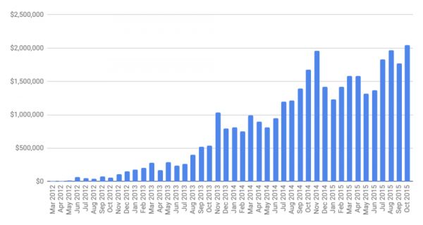 Gumroad 从 2012 年到 2015 年的营收数据 图源:Sahil Lavingia