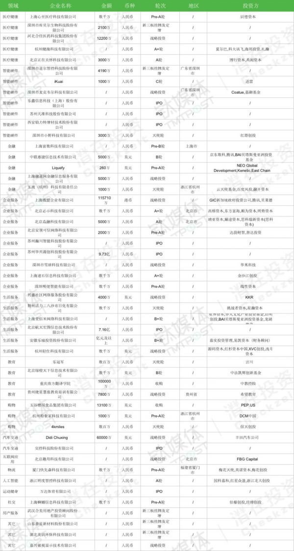 ✔. 本周重庆南方翻译学院获来自中教控股的10亿人民币收购,滴滴出行获来自丰田汽车的6亿人民币战略融资;上海微盟企业有限公司获来自GIC新加坡政府投资公司、腾讯、贝莱德10亿人民币战略融资。以上三项涉及的金额较大。