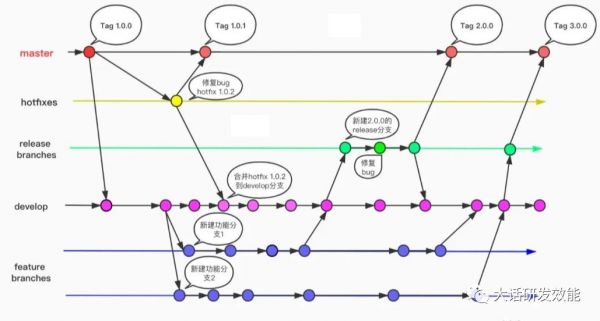 特性分支开发模式中常用的有 Git-Flow 模式、Github-Flow 模式和 Gitlab-Flow 模式等。这些模式只有细节上的差异,以 Git-Flow 为例: