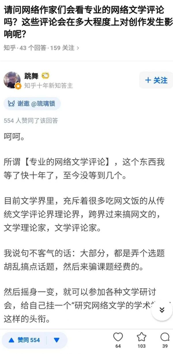 在知乎上有这样一个问题:“请问网络作家们会看专业的网络文学评论吗?”回答几乎是清一色的否定态度。