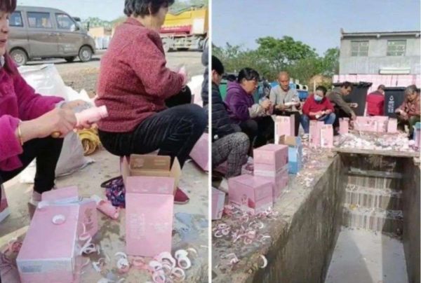 十几位中年男女围坐在沟渠旁,一箱箱牛奶摆在脚边,他们边聊天边熟练地拆开包装,留下奶盖(印有打投二维码)、扔掉瓶身、倒掉牛奶,沟渠里成了废弃牛奶的海洋。