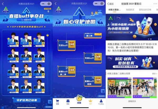 18年,农夫山泉与《偶练》首创“粉丝买水为选手打投”的营销机制,令其线下销售额翻了500倍。这一案例极大刺激了蒙牛,从19年《青春有你1》《创造营2019》开始,蒙牛便致力于研究将品牌产品和节目投票规则绑定的花式营销玩法。