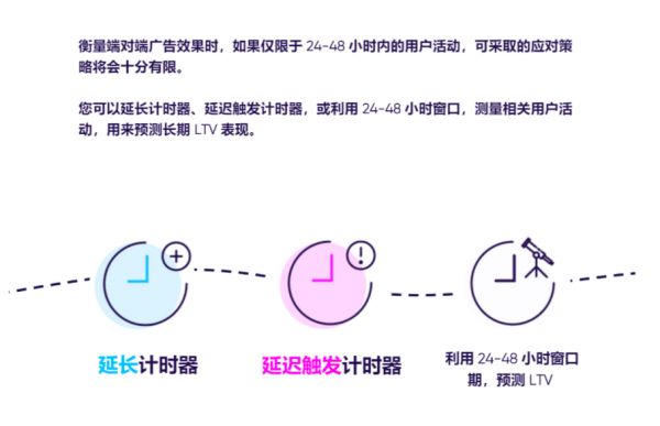AppsFlyer在最近发布的《iOS 14 时代移动应用归因与增长全指南》(以下简称《指南》)中也阐释了数据回传局限方面苹果的计时器工作原理。广告主可根据自身诉求选择延长计时器、延迟触发计时器或预测用户LTV的方式进行优化。