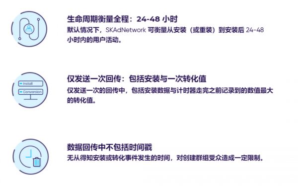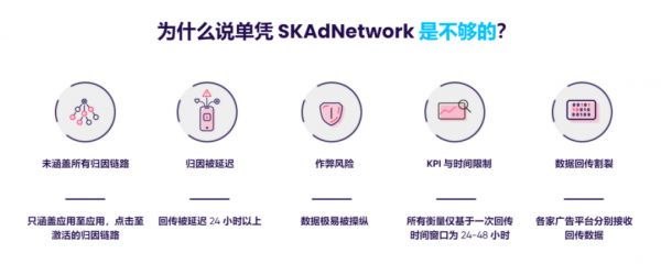 针对隐私收紧带来的广告归因问题,苹果给出了自己的一套解决方案。广告主依旧能通过苹果的SKAdNetwork实现转化追踪,但仍存在诸多限制,例如SKAdNetwork仅支持安装后24h-48h内的用户活动、回传数据有限等。