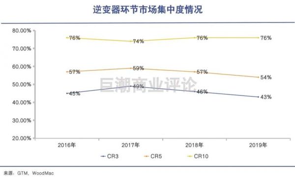 不过,逆变器行业本身其实是一个完全竞争的市场。机构WoodMackenzie的数据显示,光伏逆变器环节的市场集中度在近几年出现下滑,尤其是CR5、CR3逐年下滑,反映出行业内头部企业竞争的激烈。