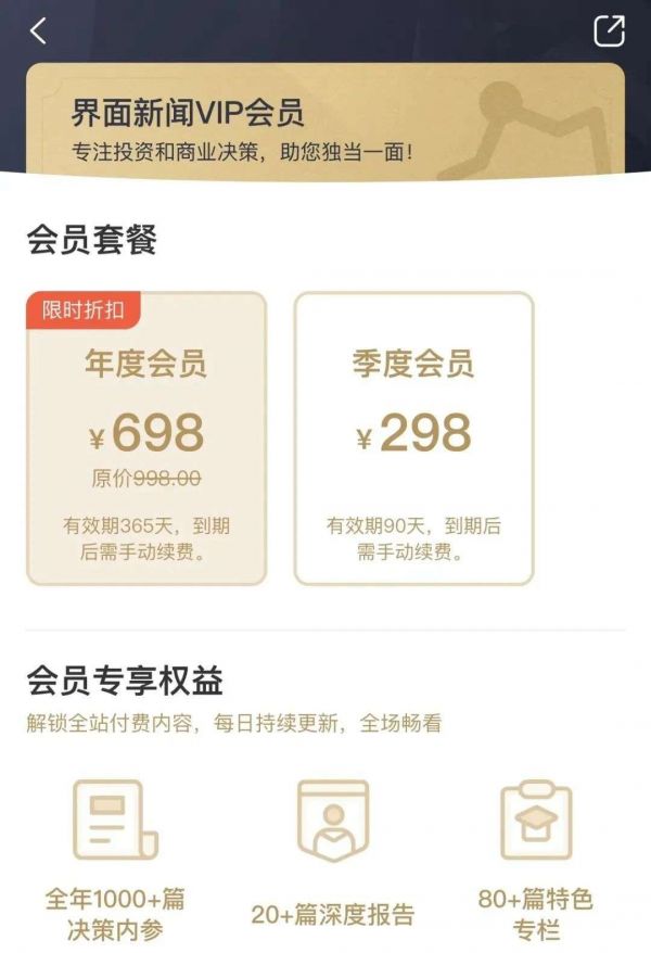 崔宇:我们从去年10月份开始了做VIP频道内容和技术上的准备。为了保证内容输出的稳定性和持续性,付费内容的机构化和专业化是大势所趋。经过七年的发展,界面新闻已经培养了200人左右的专业编辑记者团队,而且覆盖宏观、证券、投资和商业等诸多板块,我们认为有能力生产出全领域的原创付费内容。
