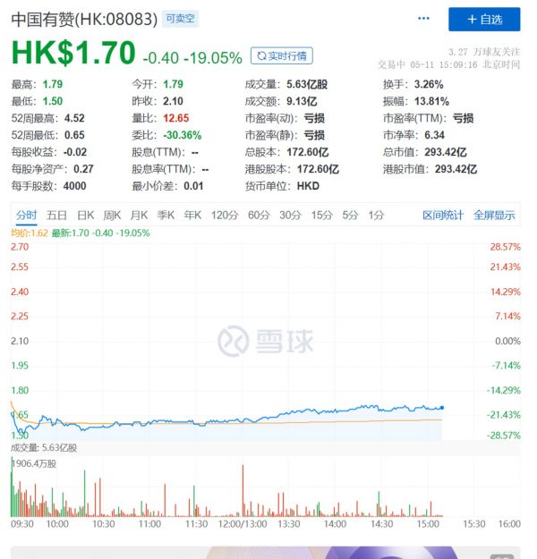 财报的发出,并没有受到资本市场的看好,次日港股开盘,中国有赞股价暴跌,一度跌幅近26.8%,截止目前,中国有赞跌幅达19.05%。