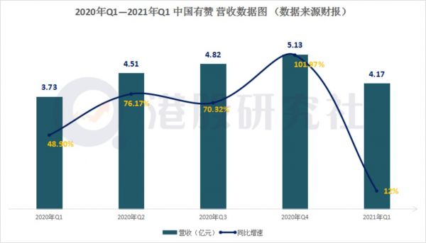 从最新披露的财报数据显示,2021年Q1,中国有赞实现营收4.17亿元,基本上符合市场及分析师的预期,去年同期为3.73亿元,同比增长11.9%;但环比2020年四季度,营收增速却是有所下滑,达到18.71%。