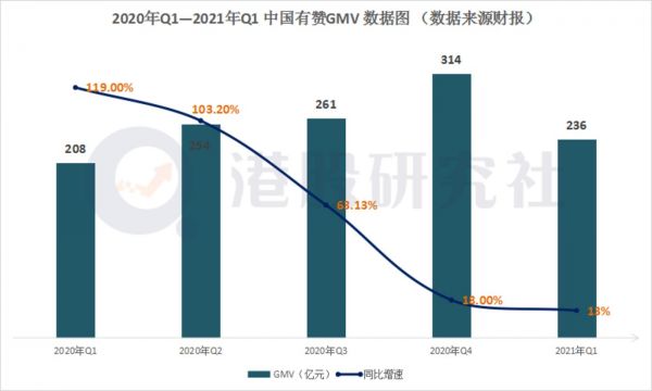 财报显示,2021年一季度中国有赞GMV达到236亿元,去年同期为208亿元,同比增长13%。