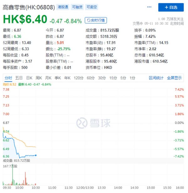 根据这十五个月的财报显示,高鑫实现收入1243.34亿元,相比2019年减少2.01%;实现净利35.72亿元,同比减少15.42%。没出意外,财报发布后,高鑫的股价今日开盘低开下跌,最大跌幅7.42%,目前报6.4港元。