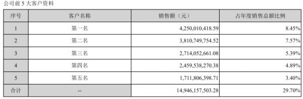 在宁德时代的年报中,其第一大客户以约42亿元的销售额占了销售总额的8.45%,第三大客户以约27亿元的销售额占了销售总额的5.39%。