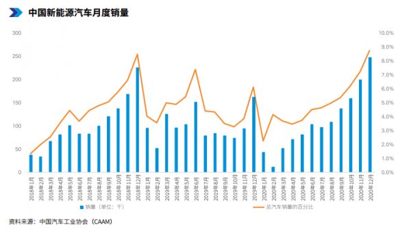对于2020年来说,新能源汽车第一个季度的销量最惨,之后开始出现上升,这种上升的势头一直持续到年底。整体来看,2020年我国新能源车销量达136.7万辆,同比增长了 10.9%。年底之后呢?