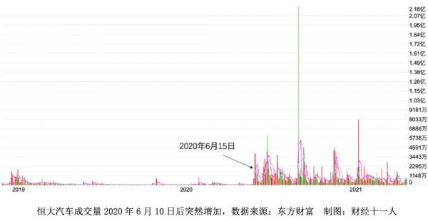 2020年6月15日,星期一,恒大汽车股票突然启动,当日成交3.64亿港元,涨幅37%。而此前12个月内,最高的月度总成交额也只不过2.7亿港元。与此前12个月的日平均成交额相比,这一天的成交额放大了约40倍。