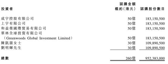 2021年1月24日,恒大汽车以每股27.3港元的价格,向6名投资者定向增发9.52亿股新股,募集260亿港元的资金。