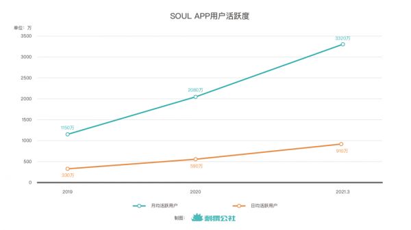 招股书显示,在规模方面,迄今Soul平台累计注册用户已超1亿,一年营收近5亿元。在用户活跃度方面,2019年和2020年,Soul平均月活(MAU)分别为1150万和2080万,平均日活(DAU)分别为330万和590万。截止2021年第一季度,Soul APP的月活为3320万,平均日活为910万,相比2020年同期分别增长了109.4%和94.4%。日活数据中90后用户占比达73.9%。
