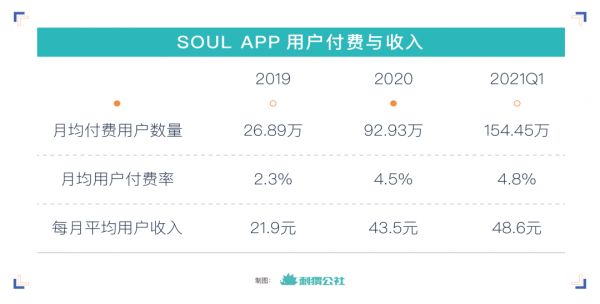 近一年时间里,Soul通过为用户提供增值服务,营收增长十分强劲。根据招股书,Soul的月均付费用户数量从2019年的26.89万增加到2020年的92.93万,2021年一季度达到154万付费用户的规模。月均用户付费率从2019年的2.3%增长至2020年的4.5%,2021年一季度达到4.8%;每付费用户月均收入也从21.9元增长到43.5元,一季度达到48.6元。