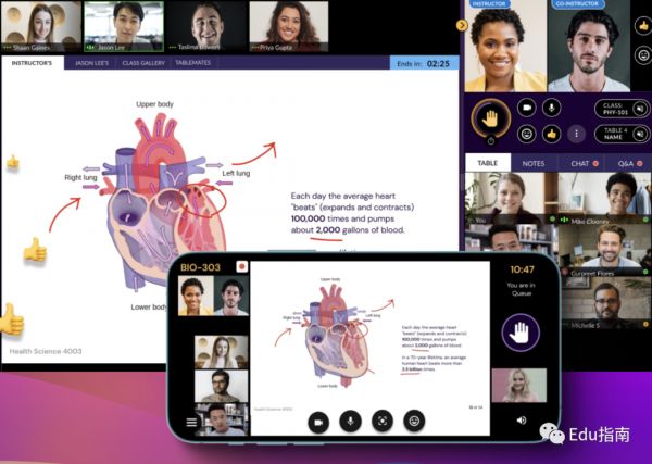 “Engageli有许多推动学习成果的功能”,除了内置视频技术来支持在线上课,还有共享和注释讲义、测验功能。