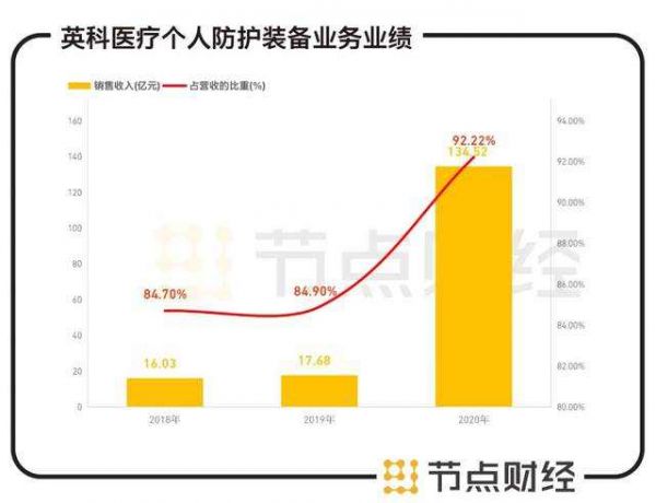 个人防护装备是英科医疗的主营业务,而重点产品便是一次性手套。招股说明书及2020年年报显示,英科医疗2018年、2019年、2020年以一次性手套为主的个人防护装备业务的销售收入分别为16.03亿元、17.68亿元、134.52亿元,占当期总营收的比重分别为84.7%、84.9%、92.22%。