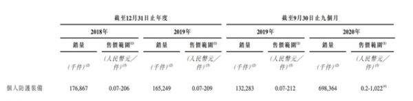 反映在英科医疗的财报里,就是销量与毛利率的上涨。招股说明书显示,2018至2019年,英科医疗的毛利率始终稳定在20%左右,个人防护装备的售价范围在0.07-209元/件,销量约在1.7-1.8亿件;但在2020年前三季度,毛利率猛增至66.7%,售价范围也增至0.2-1022元/件,翻了几倍不止,销量达到7亿件。