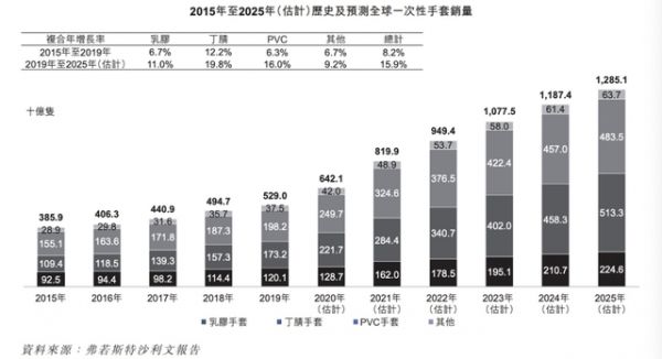可想而知,这大部分都是以一次性手套为主的个人防护装备业务的贡献。新冠疫情期间,一次性手套量价齐升。一方面,作为唯一的手部隔离防护用品,需求大幅增长。弗若斯特沙利文报告显示,2015至2019年,全球一次性手套市场由3859亿只稳步增长至5290亿只,复合年增长率为8.2%。而疫情爆发以来,预期全球销量将由2019年的5290亿只增长至2025年的12851亿只,复合年增长率达到15.9%,几乎翻了一倍。另一方面,由于手套产能扩张存在较高壁垒,供需严重失衡,因此价格也出现暴涨。