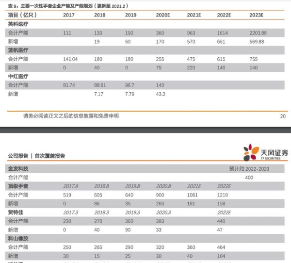天风证券研报显示,大部分公司均宣布了扩产计划。英科医疗预计2021年新增产能570亿只,蓝帆医疗220亿只,顶级手套161亿只,科山橡胶40亿只。