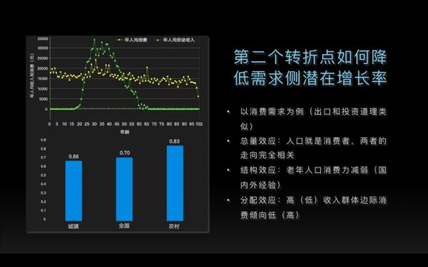 第一个是总量效应:人口就是消费者。大家看这个图,横坐标是年龄,从0岁到100岁,钟型分布的图是劳动收入,20岁以后人们才会有收入,60岁以后劳动收入就没了。但看黄色的这条线是消费,从生下来那一天到去世那一天,每天都在消费。所以人口就是消费者,人口增长慢了,消费就增长慢了,人口不增长了,消费就不增长了。有人说,人口少了我们可以消费得更多、更好,这个是对的。但是我们在人口不断增长、消费者不断增长、消费不断增长的时候,同样也可以消费得更多、更好。因此,假设其他条件不变,人口减少就是消费者减少,就是消费的不足。