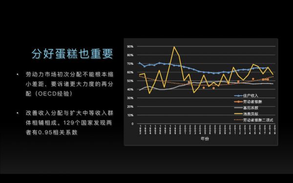因此分好蛋糕十分重要。大家从这个图可以看到,我们现在表达国民收入初次分配状况的指标,总体上长期来看都是一个平坦的U字型曲线,住户收入占比、劳动者报酬占比、消费贡献率都是这样。中国的基尼系数长期看是一个平坦的倒U字型曲线,这就意味着,所有这些因素都会和收入分配状况密切相关,改善收入分配是可以解决劳动者报酬占比、住户收入占比等等消费力水平的。因此,未来必须要解决收入分配问题。