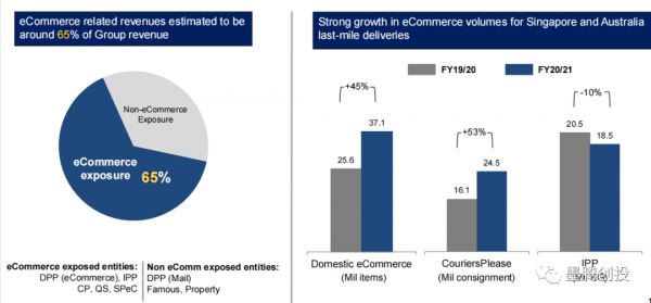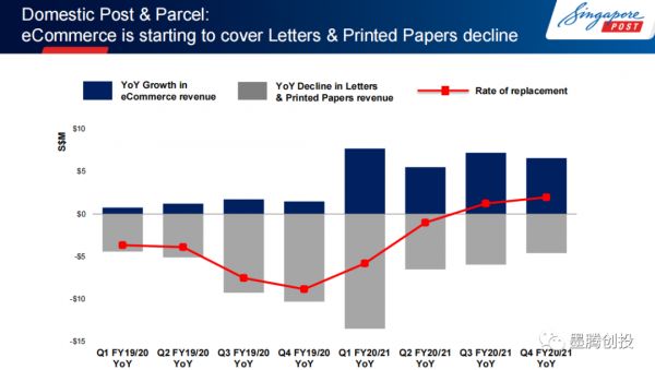 但同样是受到疫情的推动,旗下电商业务(Singapore post ecommerce)实现了强劲增长,电商相关业务贡献了65%的营收,让新加坡邮政在疫情的冲击下仍取得了6.9%的营收增长率。