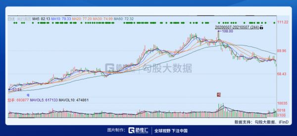 拉了下美的一年的股价走势,今年2月10日创下历史最高价108元,伴随着茅指数下行,股价下行,5月7日收在了最低位,回撤了30%。