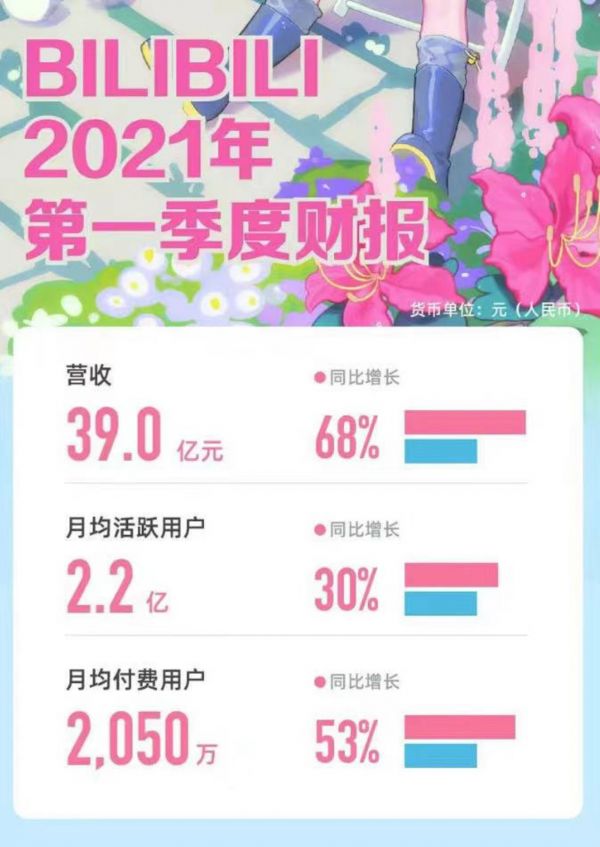 业绩快报 | 哔哩哔哩2021年Q1总营收39亿元,同比增长68%