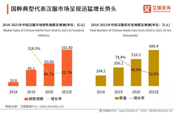 艾媒咨询今年1月份的报告显示,中国汉服爱好者数量规模和市场规模快速增长,预测2021年汉服爱好者数量规模达689.4万人,市场销售规模将达到101.6亿元。