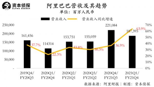财报显示,阿里巴巴第四财季营收1874亿元,同比增长64%,高于市场预估的1804亿元。
