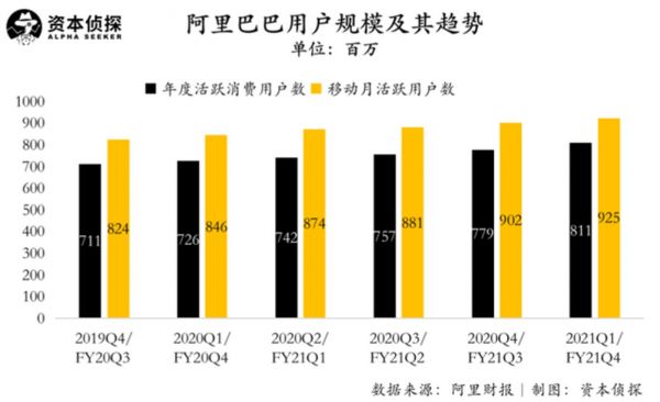 活跃用户数方面,截至2021年3月31日的12个月期间,阿里巴巴中国零售市场的年度活跃消费者数量为8.11亿。