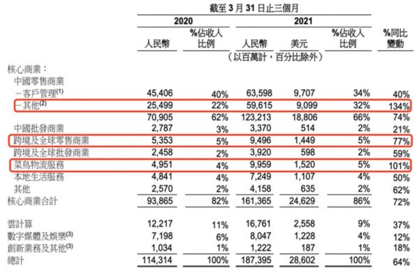 财报解释,该项业务收入的大幅增长主要来自合并高鑫零售,以及包括天猫超市在内的直营业务贡献所驱动。