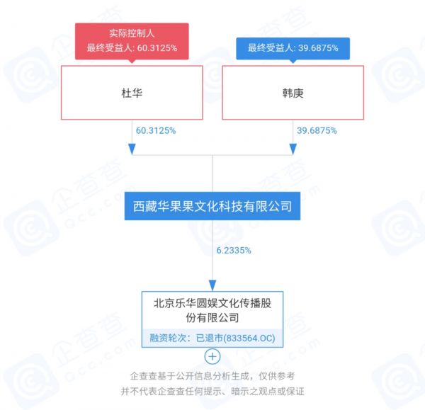 根据乐华文化公布的招股书,韩庚、周笔畅、黄征通过入股西藏华果果公司,在乐华间接持股,韩庚持有西藏华果果39.69%股份,折合成最终持有乐华文化2.47%股份。