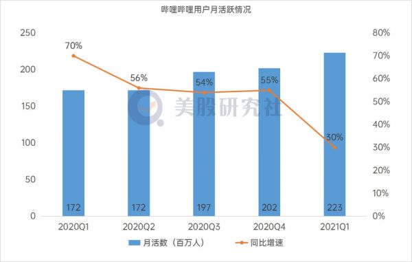 5月13日美股盘前,B站公布了赴港二次上市以来的第一份财报,其中核心数据均实现了超出预期的增长,财报显示,截至2021年3月31日的第一季度,B站实现营收39亿元人民币,略高于彭博分析师一致预期的37.8亿元,同比增长68%;月活用户(MAU)2.233亿,同比增长30%;每月平均付费用户(MPU)2050万,同比增长53%,整体付费率提升至创纪录的9.2%。