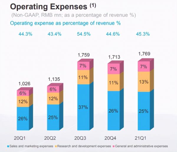 从具体支出来看,B站在Q1季度的营销费用为10亿元,略低于上一季度的10.2亿元,同比增长65%。一般及行政开支。一般和行政费用为3.885亿元人民币,同比增长127% 。研发费用为5.803亿元人民币,同比增长95% 。
