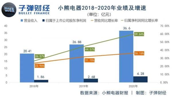 不过,与往年相比,小熊电器的成长性仍然值得肯定。2020年,小熊电器营收同比增长36.16%,达到36.6亿元;实现归属于上市公司股东的净利润4.28亿元,同比增长59.64%,均创下2018年以来的增速新高。