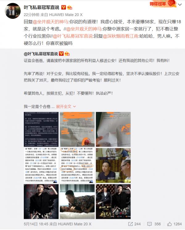 从5月9日爆料的中源家居“黑吃黑”事件起至今,叶飞的爆料仍在持续。昨晚,叶飞又进行了一个半小时的直播,不仅牵扯出了更多上市公司,还在粉丝群曝光了相关语音,连续发了上百条微博。