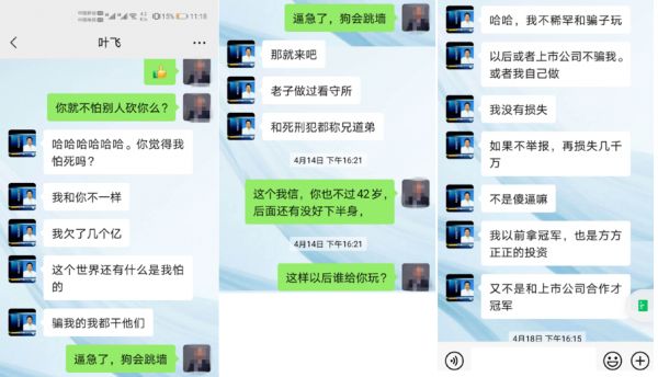 “看我最近跟叶飞的聊天就知道叶飞的性格了,只要有人得罪他就天不怕、地不怕的那种,包括光头我跟他也没有实质的业务往来。我怕有一天我得罪他了,他也会这样对我的。”该好友说道。