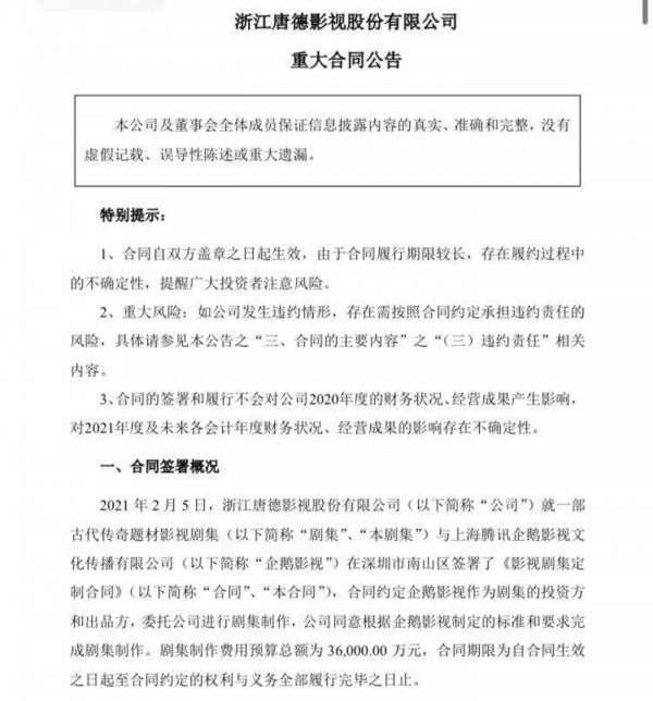 今年2月,唐德影视与腾讯企鹅影视签订合同,合同表示,企鹅影视作为委托方和出品方,委托唐德影视进行剧集制作。剧集发行许可证集数为45集,制作费用预算总额达到3.6亿元,包含了唐德影视获得的承制费是2500万元,而当剧集集数低于40集,预算费用为3.35亿元,唐德影视不提取承制费。
