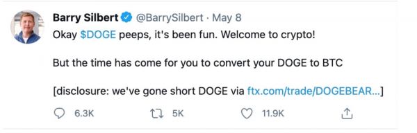 5月8日,灰度也高调进入战场,巴里·西尔伯特连续发了几条推特表示将开始大幅做空狗狗币,并表示会将赚到的收益都捐献给金融教育和与比特币相关的事业。他发文说道“好了,狗狗币伙计们,欢迎来到加密世界!但是现在是时候将你的狗狗币转换成比特币了。”而巴里的表态,也被认为是老币人向新币人们的“宣战”。