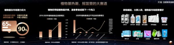 最后,需要被提及的是植物基热潮。数据显示,如今天猫植物蛋白饮品市场销量增速高达800%,购买人数上升900%,在饮料市场中成长贡献占比高达15.5%。